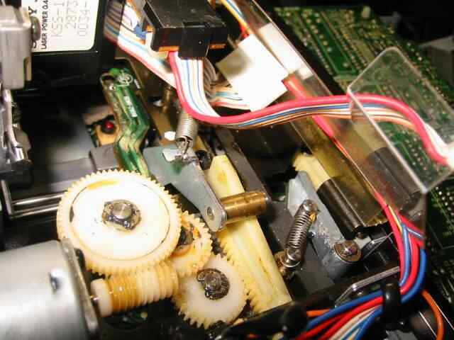 ツメを取り出し、シャフトの軸と穴を清掃します。 その後、穴にグリスを塗ります。 後ろに見えるビスの大群は正味これだけビスと外さないとメカが外せないのでバラした訳です。 |