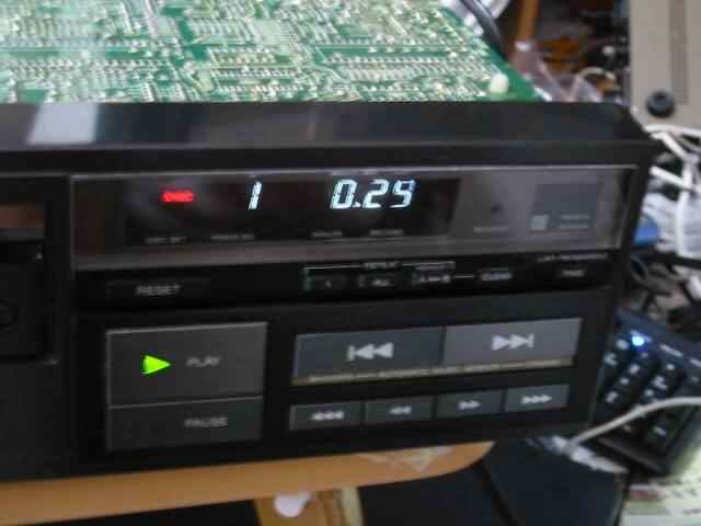 トレイも開いて無事に認識、再生出来ました。 当時のFLはシンプルでしたね。 操作系を見て気づきますが、停止ボタンがありません。 代わりにRESETなるボタンがあり、これを押すと停止出来ます。 また、メモリー再生機能もありません。 基本的にボタンの絵記号はカセットデッキのものそのままですが、シンプルでよく考えてあると思います。スキップボタンなど誰が考えたやら、と。 |