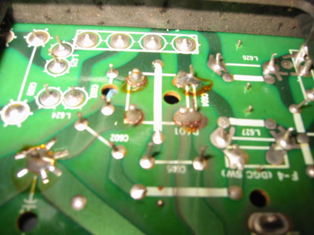 | ピンぼけで申し訳ないです。 手前の大きな2つのうち、左がハンダ修正をしたもの。 右は未修整のもの。ハンダの劣化は見た目の通りです。 |
