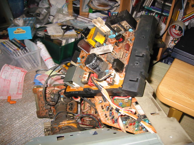 | 近所の某所にこれが出ていました。 「電源一応入ります、映像出ません、画面TCコード焼けあり、外観汚れ、傷有り」でした。 なんやねん一応って? ふつーなら狩って帰らんぞ! というような程度のブツを保護ってしまいました。 モニターでなくテレビだったら買わない罠。 まぁ3000円だしね(笑 写真は修理後のものです。 |