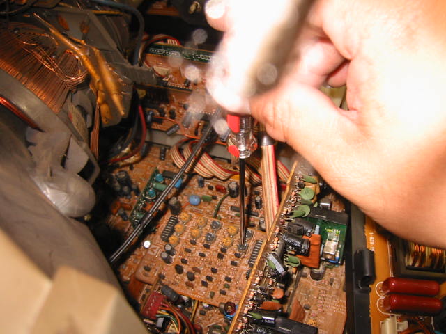 カットオフを調整します。 その調整箇所はかなり内部です。 電源基板を取り外します。 |