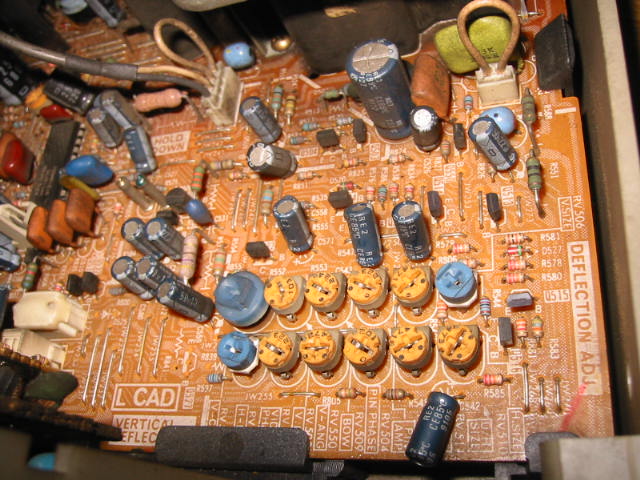 これがカットオフ調整のVR。 色温度9300°Kにて調整します。 手前の4個を調整します。 なお、Gは固定でRとBを調整します。 |