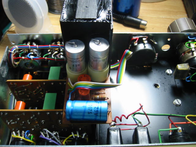 | プリはさしたる不具合も無かったので、問題はパワーの405でしょう。 一応、液漏れの痕跡が見えた、写真中央に位置する100uF/16V2個を交換しました。 AU-X111MOS Vintageへ接続しチェックしましたが、問題はなさそうです。 しかし見事な作品とも思いますね、内部を見ていると・・・。 |
