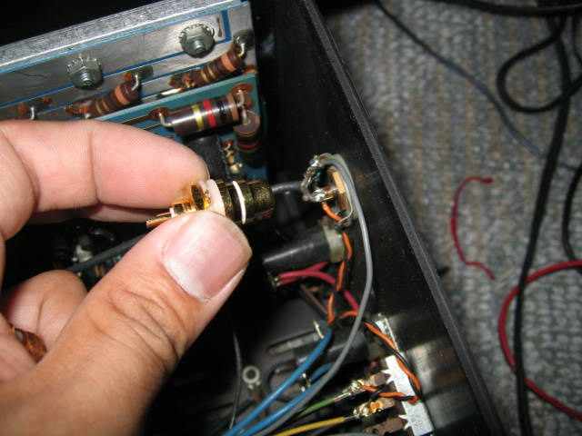 | このアンプの不具合は入力端子の接触不良でして、手持ちのRCA端子と交換することにしました。 | |