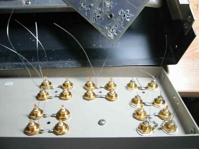 これも検討中の一こま。 この上から基板をかぶせてハンダ付けするつもりでした。 なぜ端子が3個しかないのかというと、 「どうせフォノとAUXとプリアウトしか使わないから」 という依頼主からの要望でもありました。 フォノ以外の入力はコールドラインが共通でした。 |