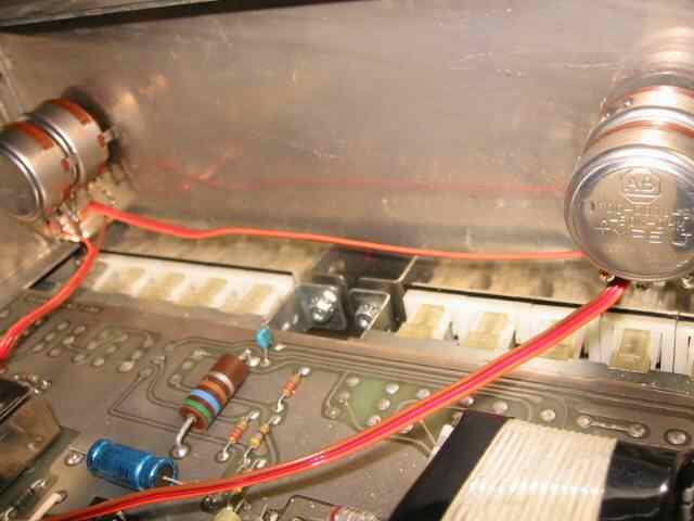 このアンプの特徴的な部分のスイッチですが、これという高級品ではなさそうに見えます。 ボリュームはどうなんでしょう? そういえばこれもシールド線じゃないなぁ、こんなもんなんかな(笑)。 |