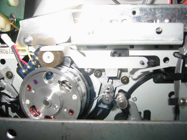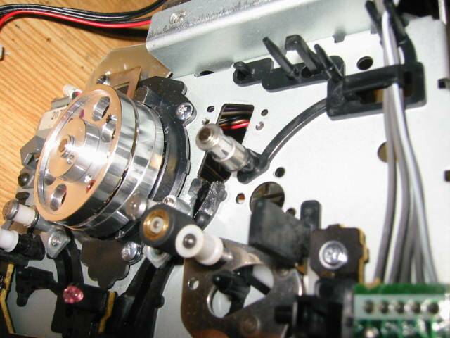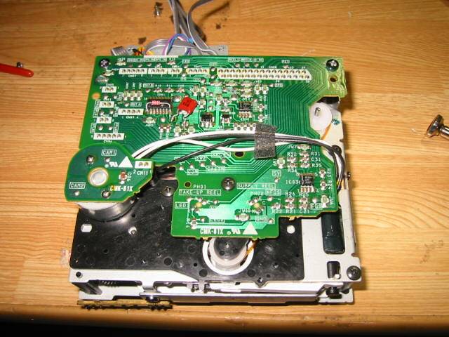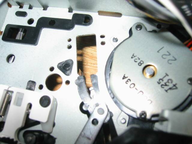 メカを取り出して、裏にある基板を取り外したところ。 ポストの受け、キャプスタンモーターは取り外しました。 ポスト裏の部分ですが、特に不具合は見られませんでした。 |