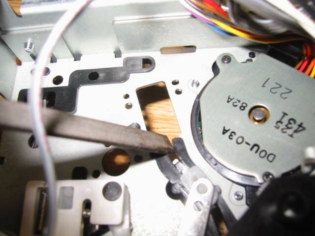 しかし好調にならないデッキ。 メカを観察すると、写真の通り、右側のローディングポストが上がりきってない事が判明。 再生操作をすると、その時にはショックで上まで上がりますが、その際にテープを引っ張り出してしまい、メカにからみつくなどの問題が出ていました。 |