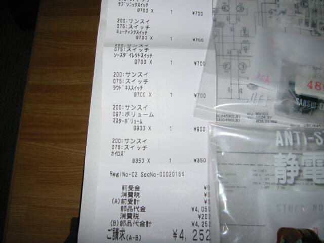 トーンスイッチは在庫がないとかで、それ以外のスイッチ、ボリュームは手配出来ました。 ついでに回路図も入手。 |