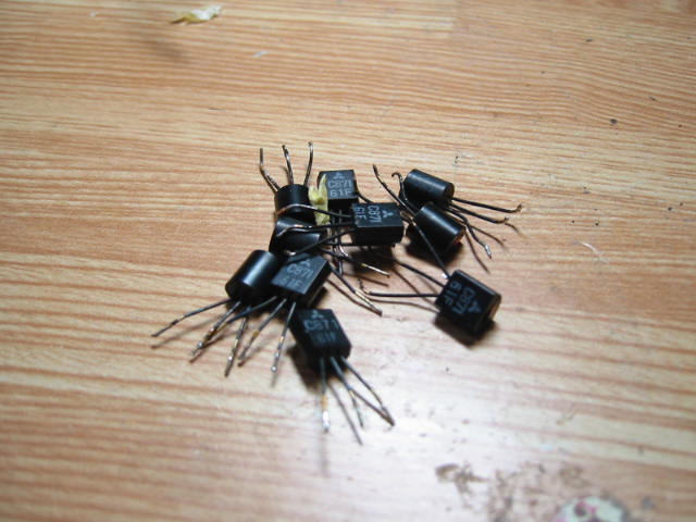 | 手持ちの2SC1845に全て交換してみました。 ボリュームの横の丸い部品は多分トランスです。 |