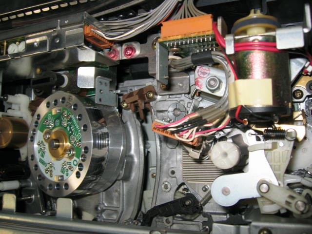| IQメカ近影。ローディングモーターが見えます。なぜだかこれだけがベルト使用ですが、多分メカニカルヒューズの役割もあるのでしょう。 | |