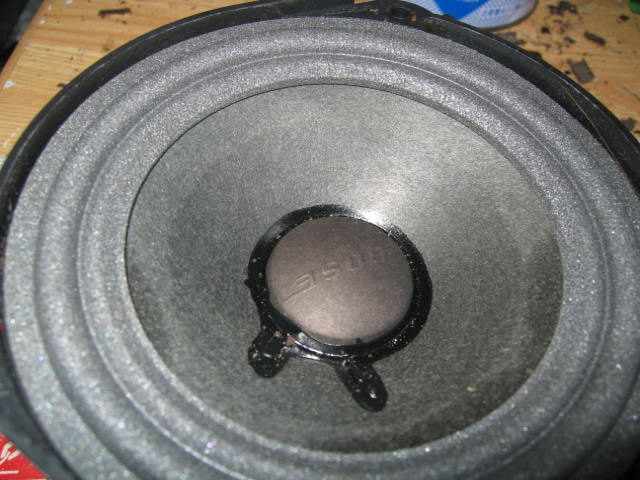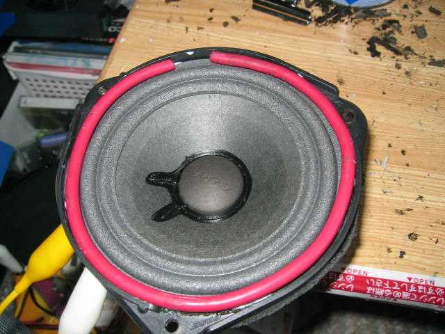 | 裏からコーンを押し上げて出来る隙間はこの程度です。 ドライヤーなどで熱風を当てて少しボンドを乾かし、続いてスピーカーに信号を入れて音を出し、おおまかに芯が出ていることを確認します。 |