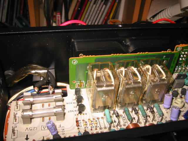 | リレーが3個ありますが、どうも出力保護を兼ねている関係もあり、モノラル各chを最終的に1つのリレーで切り替えるようです。面倒なことをしていて、接点も1つ余計に通過しているだけにこういうトラブルも出やすいでしょう。 | |