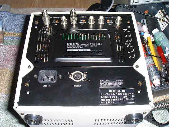 ソニーの業務用ビデオモニター、PVM−9220型、9インチです。 ジャンク8000円で購入。lはっきりいって内容確認程度にしか使えませんが、やはりラックに入れるとそこそこ引き締まりますね。 購入してそろそろ半年、最近電源を入れて30分くらいすると映像が出なくなることがあったので、半田クラックを疑い、今回開腹修理を行いました。 |
