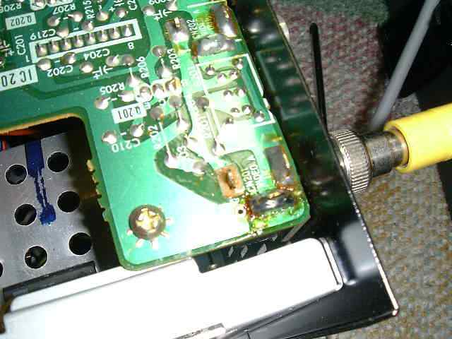 | さて不具合箇所ですが、あっけなく見つかりました。ビデオAの入力端子コネクタ部の半田付けが割れています。早速手直しします。ちなみに、ホット、コールド、それぞれ割れています。 | |