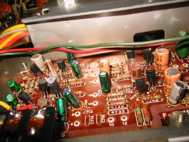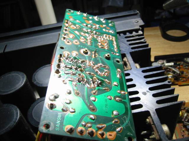 | 修理中のフラットアンプの様子。 トランジスタなどは以前の修理で交換されているようです。 しかし、修理しているのを見ると漏れと同程度の腕の人のようです(w |