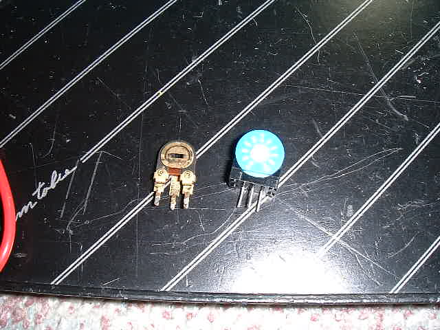 | 取り外した半固定抵抗。こんなのを回したら接触不良は間違いないですので、交換します。同じ馬蹄型ならピッチも一緒でいいのですが、経年劣化を考えてちょっとだけ上等なものにします。@290円。 | |