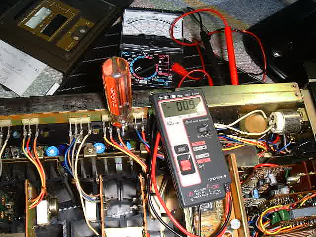 | 先日無事にトランジスタ交換を終えたAU−9900ですが、パワーアンプの修理には調整がつきもの。これをせずに部品交換だけをしてしまったのですが、一応音は出ています。しかし、イカンということで調整に挑戦することに。
