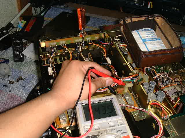 | 「2段目のVRは出力段のアイドリング電流調整用で、終段パワートランジスタのコレクタと電源間 (多分保護用のヒューズがあるので外して電流計を入れる)の電流を測るが正しいのですが、」 上記を参考に回路図を見ると、DC整流された直後とトランジスタのコレクタ間がコネクタ接続になっている様子で、実物もそうでした。ここにテスターを挿入します。 安物デジタルテスタには電流測定レンジはついていませんでしたので、会社から借りてきたマイテスタで測定してみます。 最初は300mAレンジで「オーバーレンジ」なんぞの表示が。そりゃトランジスタも熱くなるわな。 |