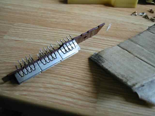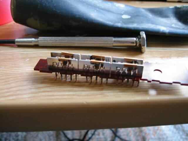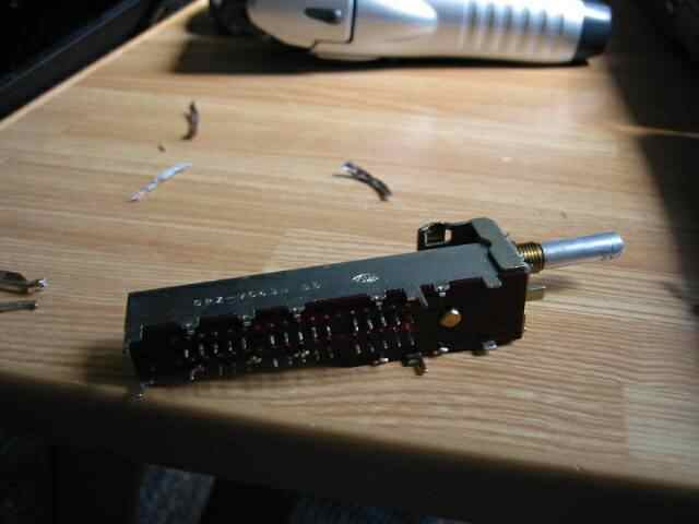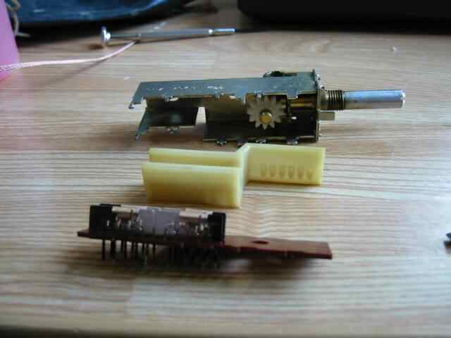 | 組み立てたスイッチ。 組み立てる前の注意ですが、ロータリーつまみ側とピニオンの位置を確認しておくこと。 可動片の向きにも注意。 また、組み立てる直前に固定片をアルコールで軽く拭いておくと良いでしょう。 ギヤに少しだけグリスを塗っておくと良いです。 接点面には接点グリスとかを塗っておくと良いでしょう。 |