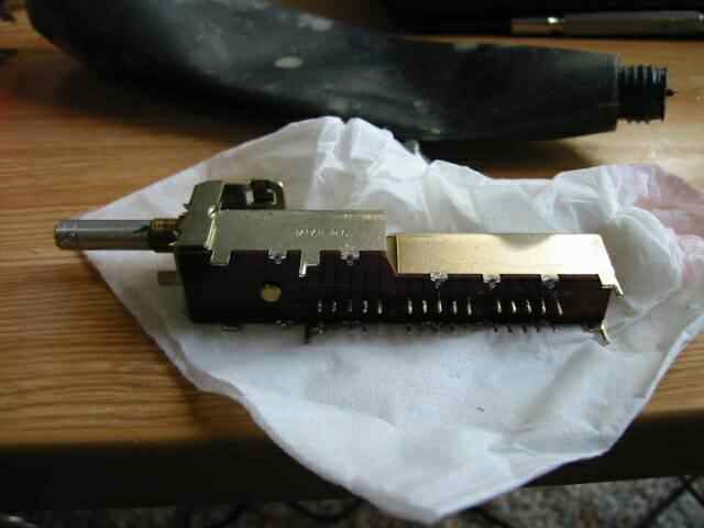 | スイッチの内部。銅色の部品が可動片で、これが前後することで回路を切り替える。 接点はわずかな部分ですので経年による接触不良はやむを得ないところ。 スイッチは密閉構造ではないので、外気が入ってきて汚損が見えます。喫煙の影響もあるのでしょう。 |