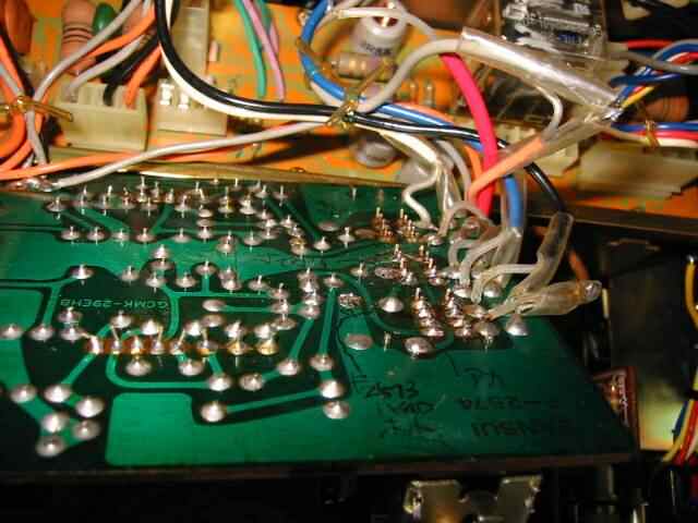 | 配線を基板にメモしておきます。最悪はサービスマニュアルで何とかなりますが、念のため。 写真は配線を外してからハンダ吸い取り機でスイッチのハンダを吸い取ったところ。 |
