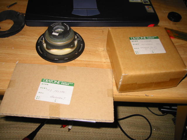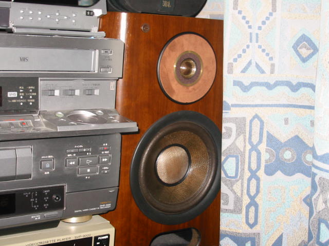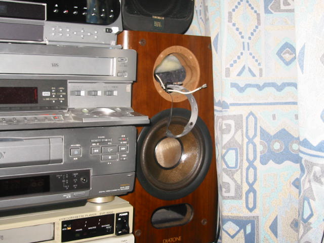 | シールを貼ったところ。 これでまたコイツは軽やかな音楽を私に提供してくれることでしょう。能率は悪いですが、いいスピーカーです。 |