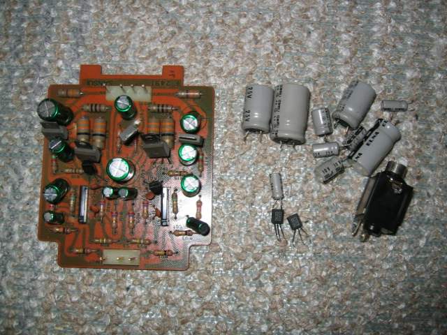 | 今回の修理で交換した部品群。 コンデンサはすべて手持ちのMUSEに、Trも手持ち品を使いました。 |