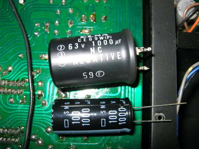 | オリジナルは1000uF63V、調達したの1000uF100V。しかし小さくなっています。 | |