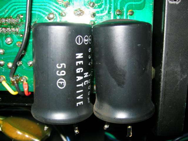 | この基板設計はマズイですよねぇ、電解コンデンサが熱の影響をモロに受けます。 それを裏付けるかのように、酷く膨張していたコンデンサは写真で言うと右下の1本だけでした。 |