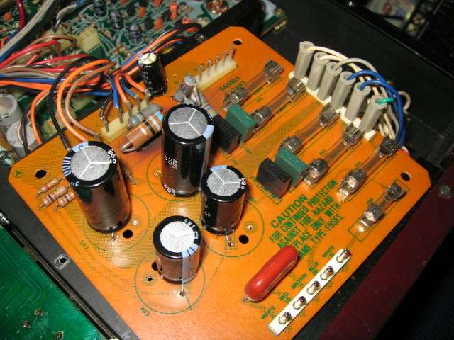 | 電源基板の様子。 抵抗が相当発熱するらしく、だいぶ焼けています。電解コンデンサの不良に起因するものかも知れません。 |