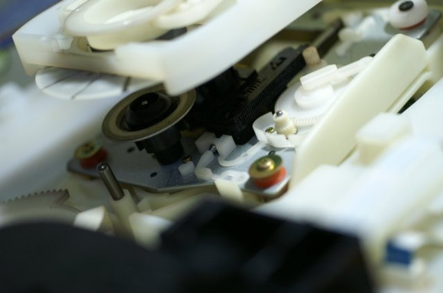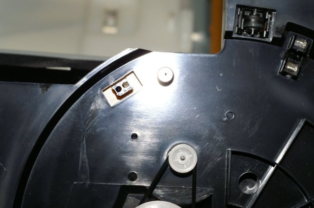 メカを良く調べると、ディスクの検出はこの左上に見える部品が行っているようです。 |