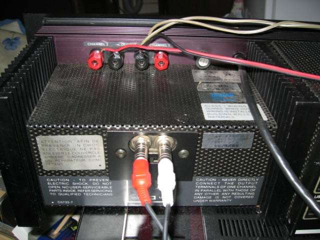 入出力コネクタ周辺。 業務用ですがキャノンコネクタも無く、シンプルなつくりです。 もともとPAアンプなどで使われる機械ですから、150W×2という出力は正直なところモニター用途なのでしょう。 |