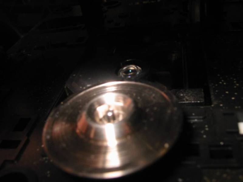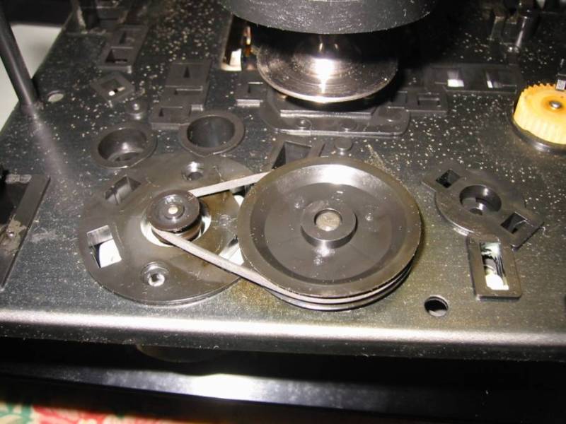 | 不思議なことに裏側を見てみると、ピックアップの駆動メカに微妙にお金がかかっているのが解ります。この方式は音飛びがしにくいです。このベルトはまだ問題なさそうだったのでそのままにしています。 | |