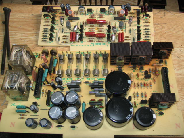 | 基板の焼け具合が使用された年月を感じさせます。 上がフラットアンプ、下が電源/プロテクト/メーターアンプ基板。 目立つのはコンデンサですが、特に危険なのは基板中央やや左の4個。フィルム後退気味です。 あと、左上のリレー右横に見える電解コンデンサ(BP)も多分抵抗の熱に晒されていて状態は悪いと推測されます。 |