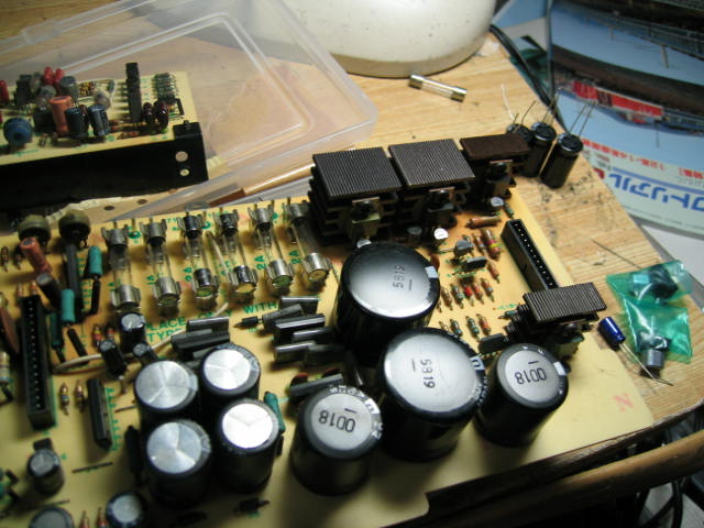 | パワーアンプ基板のメンテ中。 10uF100Vという微妙な容量の電解コンデンサのフィルムが相当下がっていたので、これは手持ちと交換します。 |