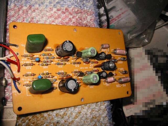 これが問題のフォノアンプ基板。 あっさりとトランジスタ3個でまとめてあるので、このトランジスタを交換すればノイズは無くなるでしょう。 |