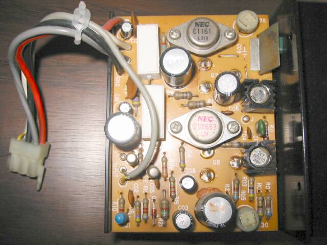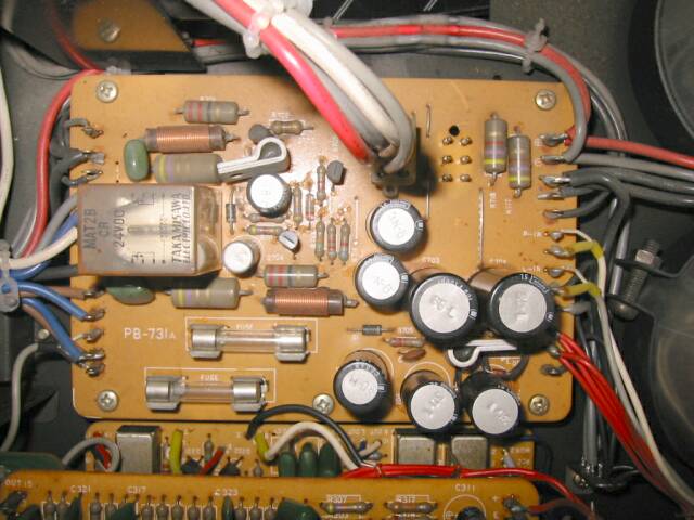 電源とおぼしき基板。リレーが古くさい。 電解コンデンサを交換予定です。 |