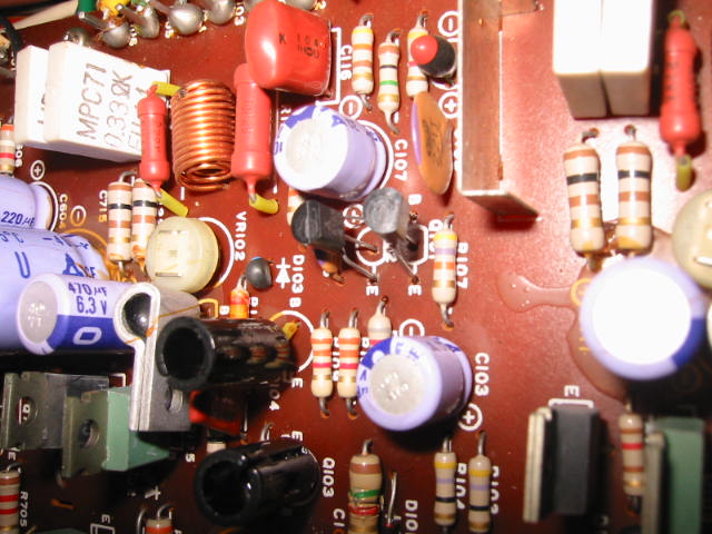 | 手持ちのTrと交換しました。外観、脚とも接続が一緒ですので違和感はありません。 なお、取り外す前に入力を回路レベルで切ってしまい、ノイズ源を確認しました。 上のP101端子が外されているのは、そういう確認を行った為です。 |