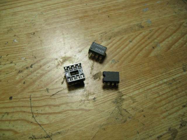 | 型式を調べるとPC4558とあります。 ネット検索するとNECの相当品がまだいまでも手に入るようです。 まぁ、費用もそんなに掛けられないので、99円ショップに行った序でにマルツ電波で東芝の互換品、TA75458を買ってきました。99円だったかな。(爆) 一応ソケットを取り付けて、音質比較などが出来るようにしておきます。 |