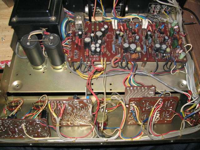 | 初段はオペアンプでさらっと作ってあります。これは手持ちがないので買ってくるしか。 ちなみに、故障の判断は回路を遡るしかありません。1枚の基板にフォノイコライザー、プリ、パワーの各アンプが取り付けられており、回路途中に入るスイッチやボリュームの為に端子出ししてあり、比較的回路は追いやすいです。 |