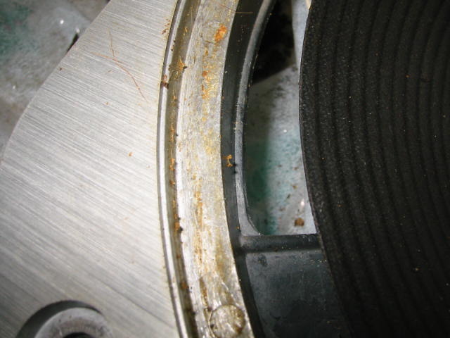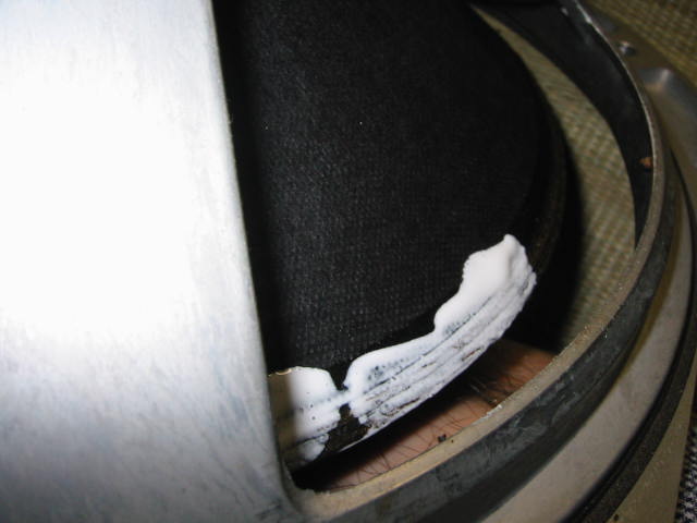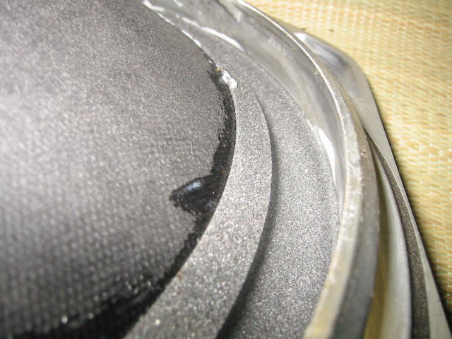 | コーン紙側は、取りあえず手でこすりながら古いエッジを落とします。 これもまたボロボロと剥がれてきます。 |
