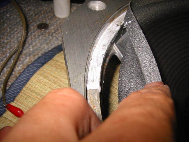 | フレームに接着も終わり、ガスケットを填め込んだところ。 今回のユニットはガスケットでエッジを押さえ込めるので有り難いです。 この状態で音を出してみます。ガサガサいったり、歪んだりはしてないでしょうか? 接着後数分であれば、まだ貼り直しできますので手短にセンターが出ているか確認をします。 |