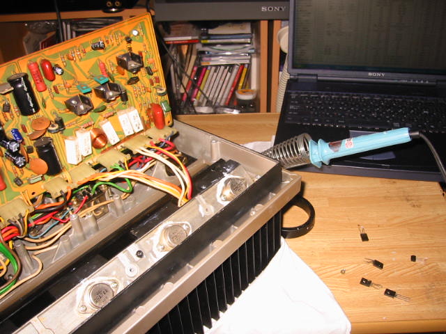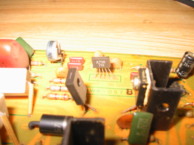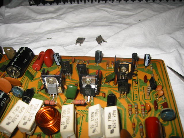 | ようやく不具合を特定しました。 写真上の、ヒートシンクがついたTrです。 脚などは汚れていないのですが、これを交換したらさっぱり直りました。 Trは手持ちに、同一品番ではないのですが、同一メーカーの1番違いの定格が大きいものがありましたので、これを交換しておきました。 続きはこちらからどうぞ |