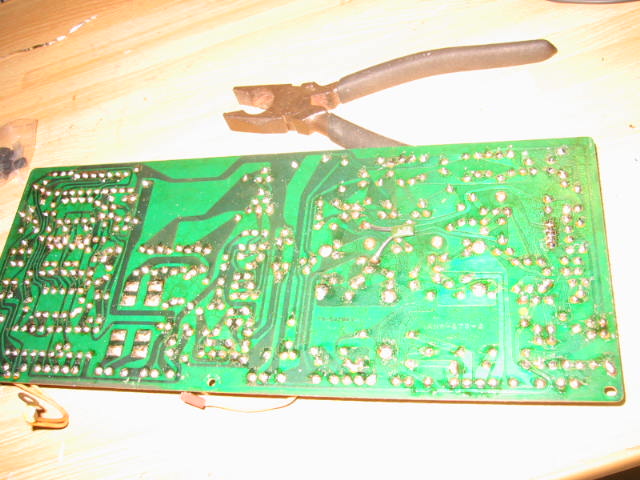 | 内部基板。電解コンデンサも怪しいので交換することにします。 | |