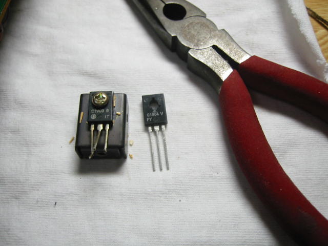 | 古い半固定抵抗の抵抗値を実測し、それを新しい抵抗でも同じ値に合わせてアンプに取り付けします。 こうしないと、大抵の半固定抵抗は最大位置か最小位置に振り切って出荷しているので、まず間違いなくプロテクトが外れなくなります。めんどうですが、実測値をセットしておく方が良いでしょう。 |
