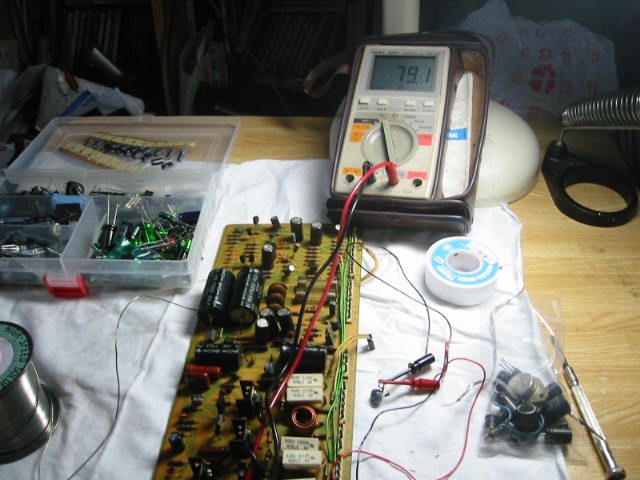 | コンデンサも交換した基板。 あとはDC調整するために、半固定抵抗を交換します。 |