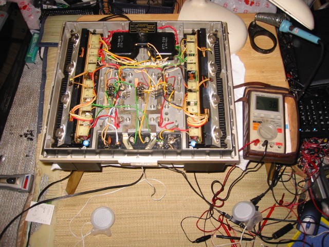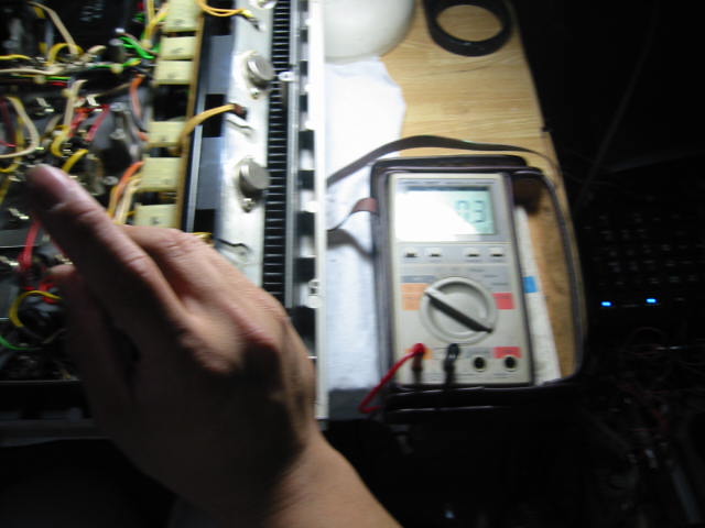 | DCを調整中です。 ほんの10分ほどの通電でもヒートシンクはかなり暖まります。やはりA級ですねェ。 |