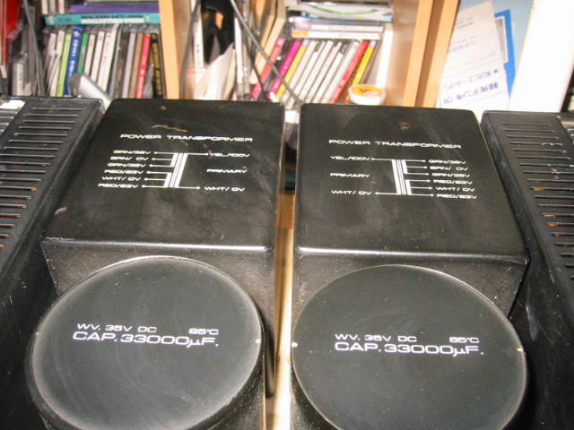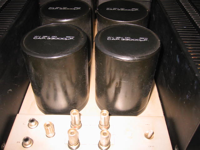 | スピーカー端子、電源スイッチ、入力端子だけと、極めてシンプルです。 電解コンデンサは33000マイクロファラドが4本。 フィルムが下がってますが((( ;゚Д゚)))ガクガクブルブル |