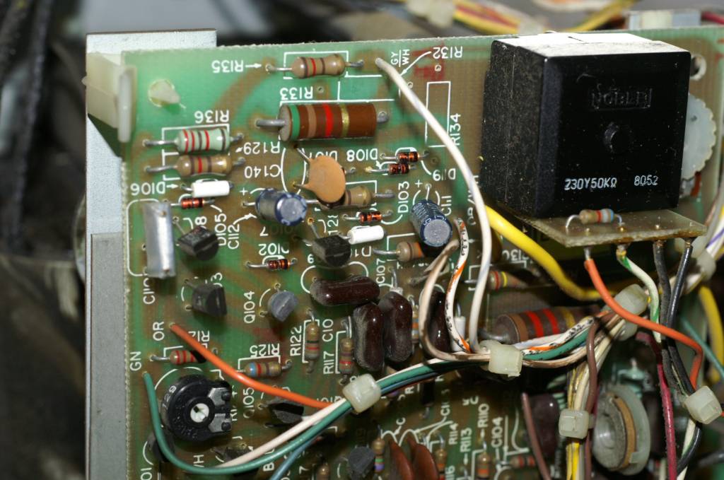 | IOCの動作を司る基板はここ、プロテクト回路基板です。 調査の結果、手前に見えるリレーが物理的に破損している事が判明。 購入時の話では「動作品」とのことでしたが、リレー接点が折れている状況ではどうあっても動作できません。 電解コンデンサは見ての通り、膨らんでいる状況で、かなり手を入れないとといけない状況です。 |
